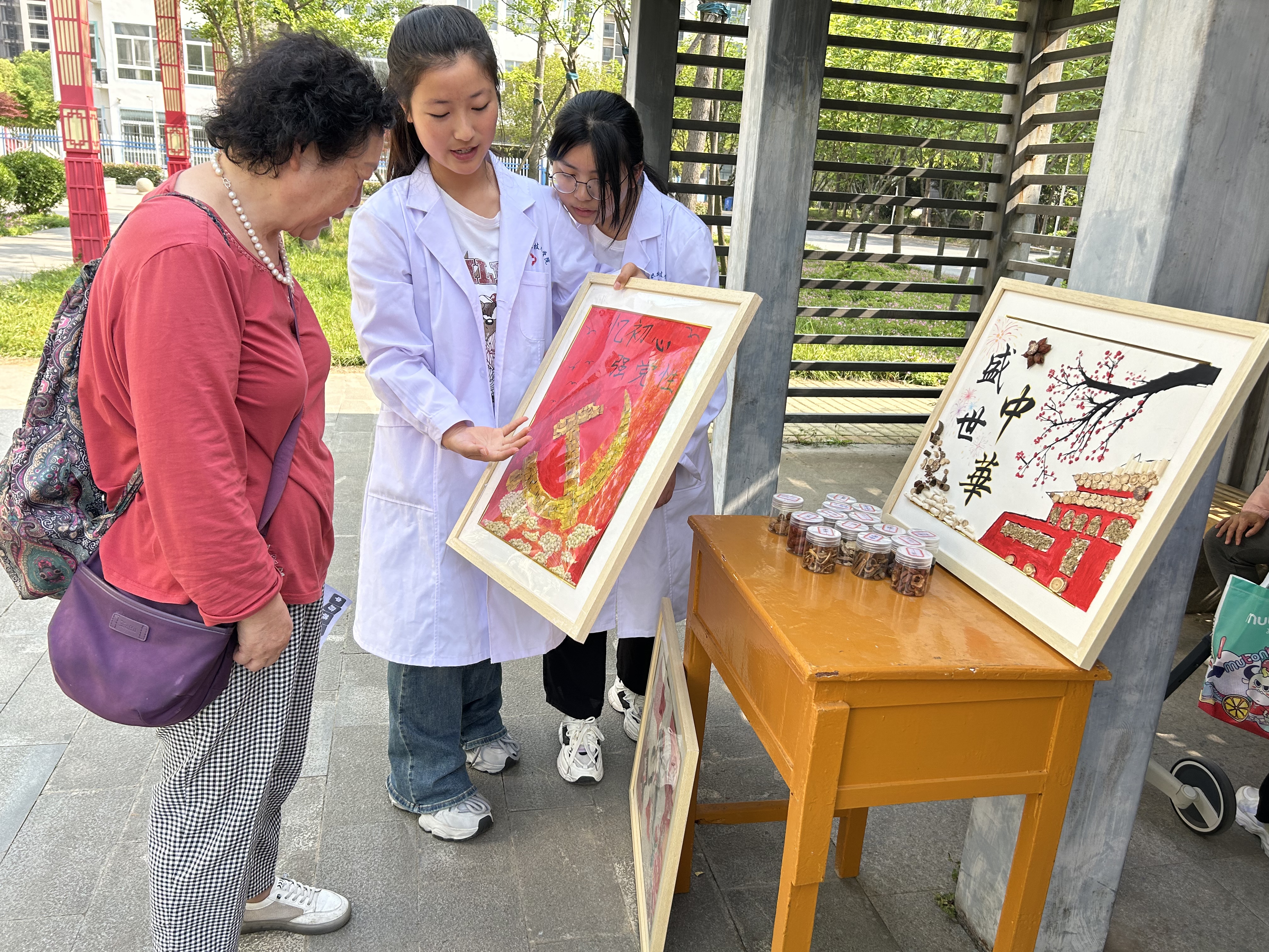“这些不是厨房大料吗?我们炖肉时常用……”在“药食同源”辨识体验区,几位阿姨拿起药材笑着问志愿者。志愿者随即引导他们感受小茴香、干姜、桑葚、枸杞等常见数味中药的色、形、味,向群众直观展现了中药和食物之间的相互联系,积极做"药食同源 "的科普知识。另外,志愿者们还提供量血压、测血糖以及健康咨询服务;并展出了数幅中药饮片工艺画作品,在现代艺术的多元化审美方面展示中草药的别样世界。