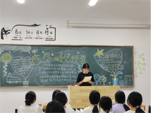 在班会上,同学们纷纷向亲爱的老师表达了尊敬和感激之情。肖家乐同学还在班会上分享了入校时辅导员白泽方老师帮助自己的经历,给同学们带来了深深的感动,空气中充斥着浓浓的师生情。