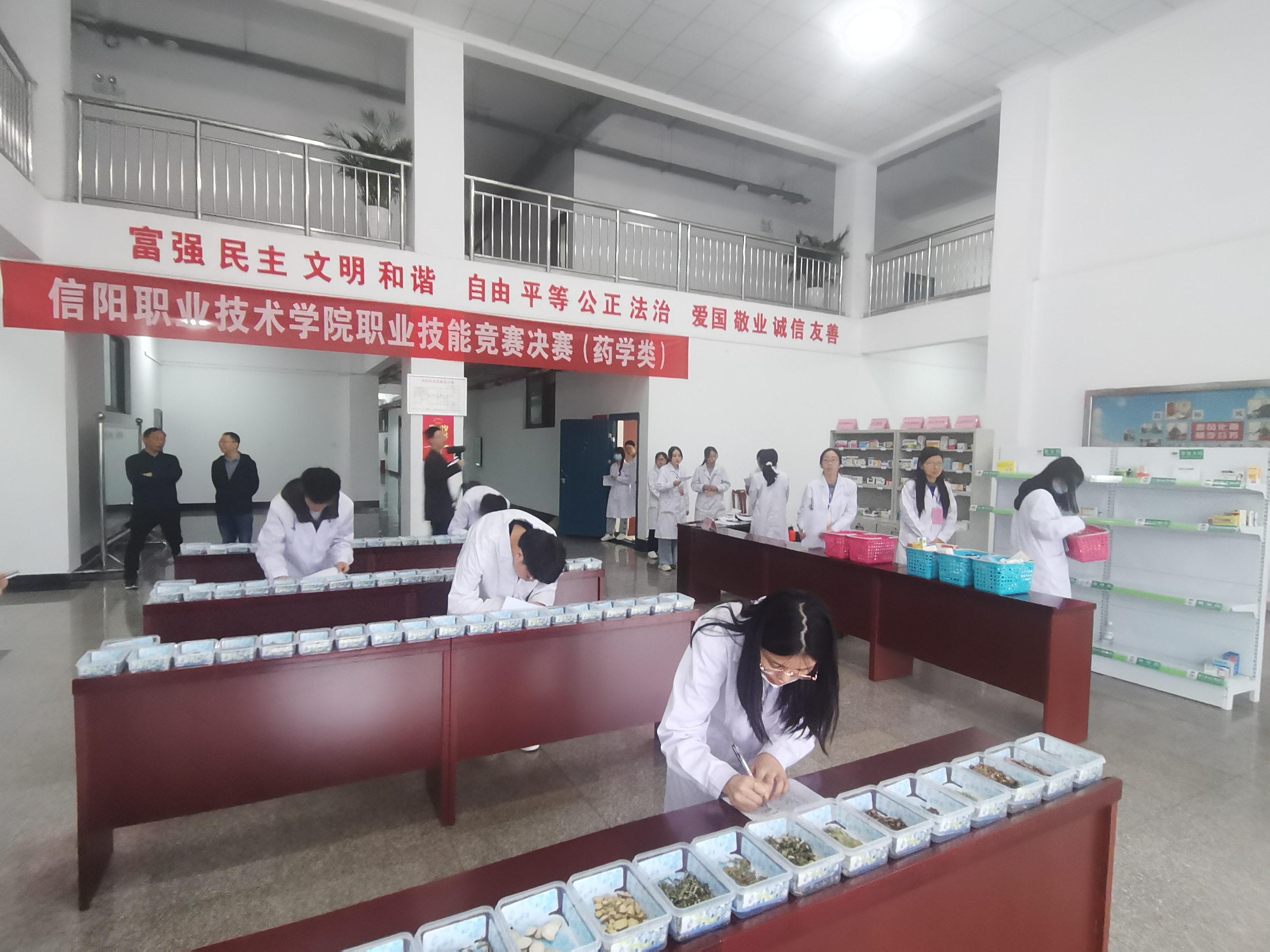 深入贯彻落实“人人持证 技能河南”的号召,进一步深化学院内涵建设和教学改革,提升教学质量,强化技能水平,女人十八片毛片60分钟于5月12日在女人十八片毛片60分钟8号教学楼大厅成功举办了“2022年信阳职业技术学院职业技能大赛(药学类)”决赛。来自药学、中药学专业60名同学参加了“中药传统技能”和 “医药商品购销”技能决赛。女人十八片毛片60分钟院长吴长忠、副院长许卫军亲临现场指导,女人十八片毛片60分钟师生观摩了比赛。
